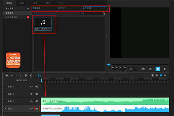 4、接著導(dǎo)入音樂音頻素材文件,也就是大多數(shù)人在觀看一段視頻時的背景音樂(當然你也可以再導(dǎo)入一段視頻,只顯示其中的視頻聲音),在粗剪音頻并導(dǎo)入之后,跟視頻素材一樣,將其拖動到下方另一個軌道中,如果你只想播放視頻中的畫面、音頻中的聲音,就將視頻素材的聲音進行關(guān)閉,如果你的音樂是視頻素材,則將軌道前端的“顯示”選項進行關(guān)閉,就可以實現(xiàn)了,最后保存項目工程或另保存就OK啦!如下圖所示: