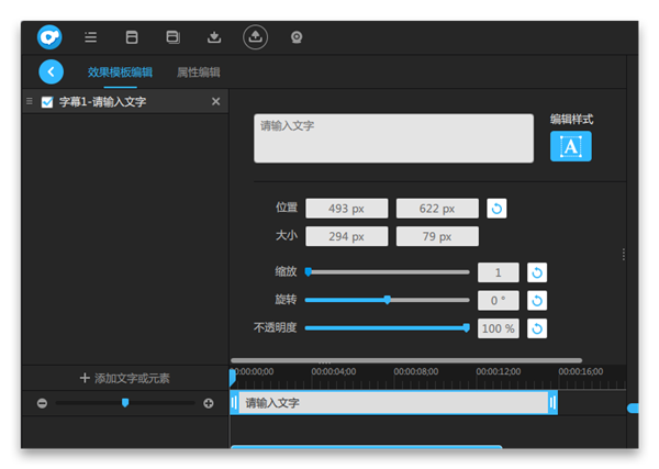 2、選中文字,點擊“編輯”,來到模板屬性編輯面板,在這里可以編輯該文字。如圖下所示,這個大的輸入框用來輸入需要的文字,點擊旁邊的編輯樣式,來到編輯文字樣式面板,在這里可對文字進行一系列的設(shè)置。