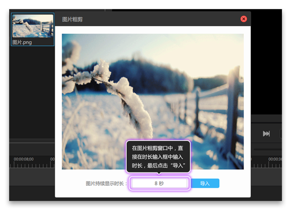3、在圖片的粗剪窗口中,直接在時長輸入框中輸入時長,單位是秒,設(shè)置圖片的持續(xù)時長,最后點擊“導(dǎo)入”,如圖所示: