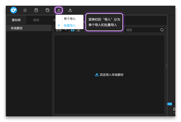 2、或者點擊菜單欄的導(dǎo)入按鈕,出現(xiàn)單個導(dǎo)入和批量導(dǎo)入。單個導(dǎo)入是每次只能選擇一個素材進行導(dǎo)入,和雙擊素材庫導(dǎo)入素材的操作是一樣的;批量導(dǎo)入是每次可以選擇多個素材一同導(dǎo)入素材庫。選擇批量導(dǎo)入,找到需要導(dǎo)入的素材,按住Ctrl或者Shift鍵選擇多個素材,或者直接用鼠標框選素材,點擊“打開”,即可導(dǎo)入素材。