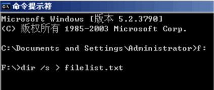 1、首先我們運(yùn)行CMD打開DOS窗口,切換到?F?盤根目錄。采用?dir?命令生成文件列表。