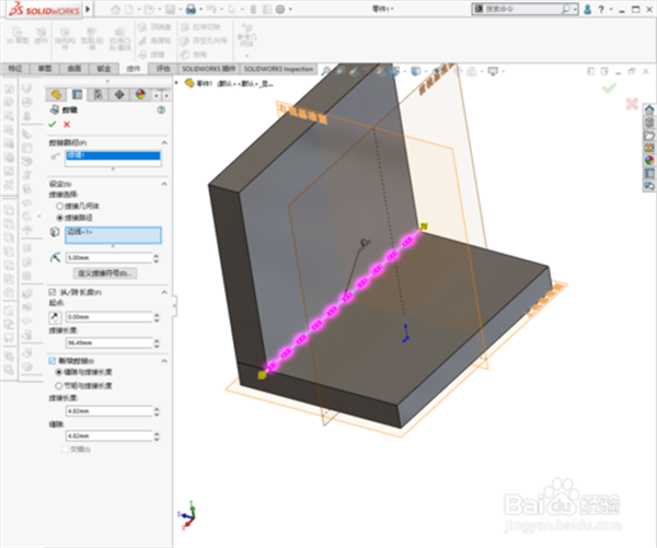 7、點(diǎn)擊確定,即可生成焊接特征。焊縫還可以設(shè)置長(zhǎng)度, 斷續(xù)焊。