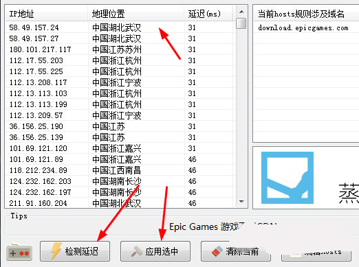 接著點(diǎn)擊【檢測(cè)延遲】,然后選中延遲最低的地址,點(diǎn)擊【應(yīng)用選中】即可進(jìn)行加速