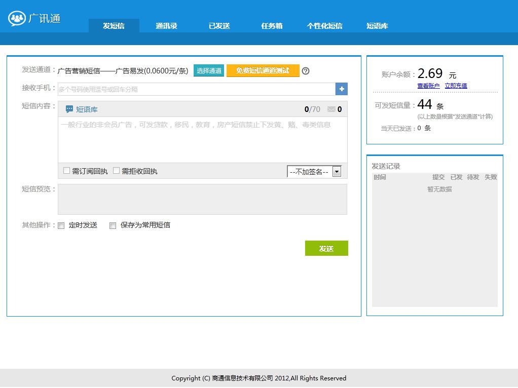 短信接收快、成功率高,更有豐富短語庫和短信模板幫助輕松實(shí)現(xiàn)內(nèi)容優(yōu)化。廣訊通客戶端支持多用戶并行發(fā)送、共享通訊錄發(fā)送及用戶限額發(fā)送,適用不同規(guī)模的企業(yè)短信應(yīng)用??舍槍?duì)通訊錄中每個(gè)人的屬性進(jìn)行針對(duì)性的發(fā)送(例如根據(jù)不同接收對(duì)象在短信內(nèi)容自動(dòng)加上不同稱呼)。