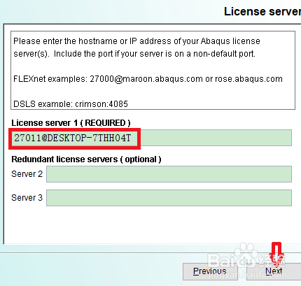 回到最開(kāi)始運(yùn)行setup.exe的窗口,在第一個(gè)框里輸入27011@主機(jī)名,點(diǎn)擊next
