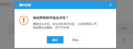 點擊“操作”下“刪除”按鈕彈出“刪除提醒”彈窗即可,不過需要注意的是:刪除后包括你站點下面設置的客服人員等相關信息也都一并刪除了。(如圖所示)