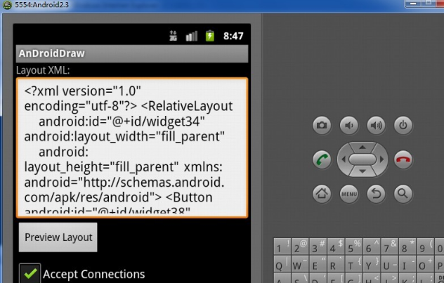 當(dāng)然,你也可以只使用DroidDraw設(shè)計(jì)UI,然后把設(shè)計(jì)好的xml代碼復(fù)制到android項(xiàng)目的布局文件中,直接運(yùn)行看結(jié)果
