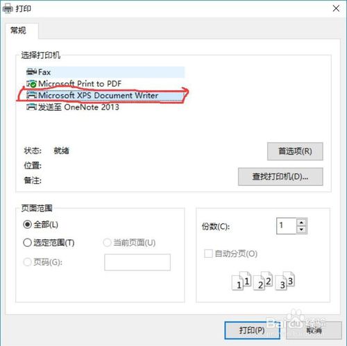 4、選定“Microsoft XPS Document Writer”,然后點(diǎn)擊“打印”。