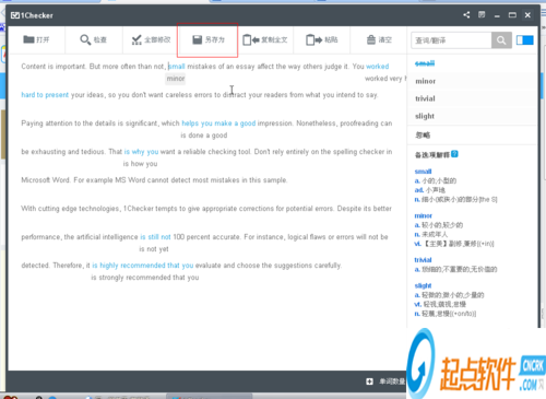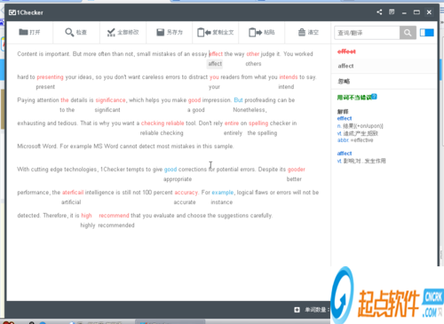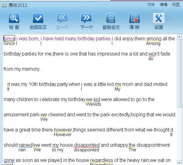 都知道英語寫作在考試比分中占了很大部分,易改英語寫作軟件是全球最領(lǐng)先的英語寫作校對軟件,提供寫作錯(cuò)誤解釋、整句翻譯、雙詞對比等輔助查詢,大大提高我們的英語寫作水平。錯(cuò)誤歷史統(tǒng)計(jì)和錯(cuò)誤詞匯統(tǒng)計(jì)您可以在“用戶中心”欄目內(nèi)的“糾錯(cuò)歷史”中查看您的錯(cuò)誤統(tǒng)計(jì)和詞匯統(tǒng)計(jì)。易改會為您記錄糾錯(cuò)歷史和詞匯水平,以方便您更有針對性地提高英語水平。