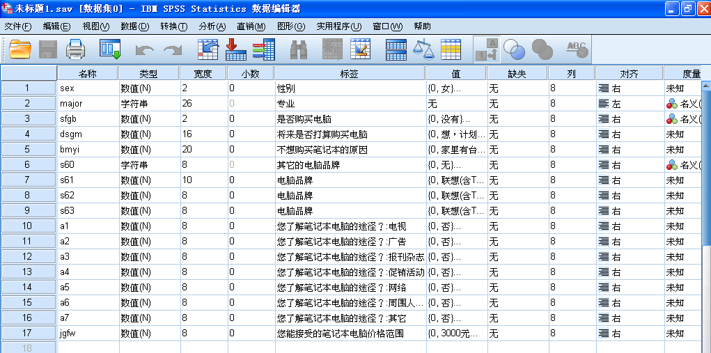 4、點擊變量視圖,即可出現(xiàn)如下界面。我們可以看到變量視圖中,第一個變量可以設(shè)置的包括名稱、類型、寬度、小數(shù)、標(biāo)簽、和值等設(shè)置類型。