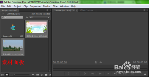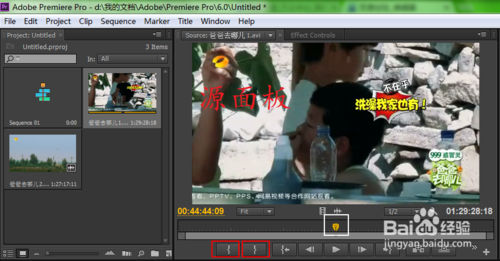 4、雙擊素材面板中《爸爸去哪兒1》,右邊窗口“源面板”便會顯示預覽,在源面板中我們可以進行簡單的視頻剪輯和處理?,F(xiàn)在我們先來看一下“源面板”上的按鈕吧,圈住的分別是入點和出點;而白色方框圈住的是滑塊,代表的是視頻進度。
