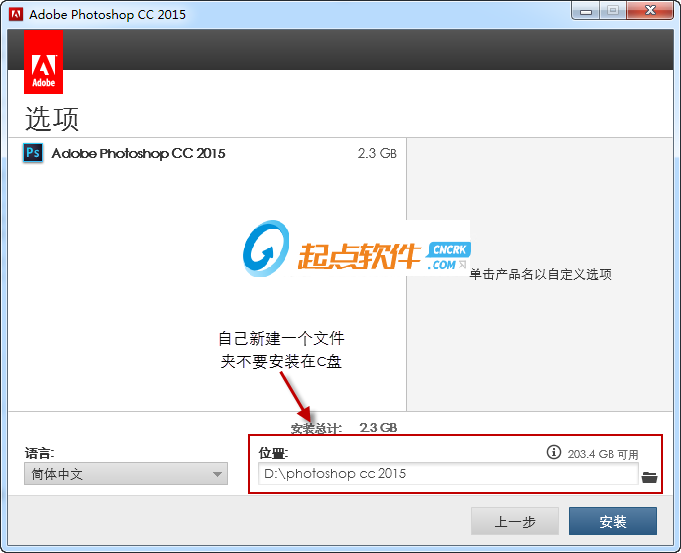 6、登錄操作完成后就進(jìn)入安裝內(nèi)容界面了,由于Photoshop cc 2016占用的空間比較大,建議不要裝在c盤(pán)。