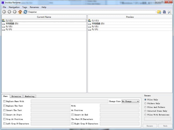 運(yùn)行后,Inviska Rename界面的中間左側(cè)部分【current name】和資源管理器一樣,你可以使用它瀏覽到需要批量重命名的文件夾路徑下,中間右側(cè)【preview】則是對重命名結(jié)果的預(yù)覽。對于重命名的操作則全部集中在界面底部的標(biāo)簽頁中,右下角則是用來篩選和過濾需要重命名的文件。