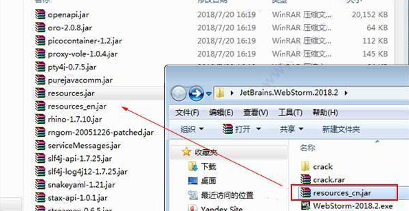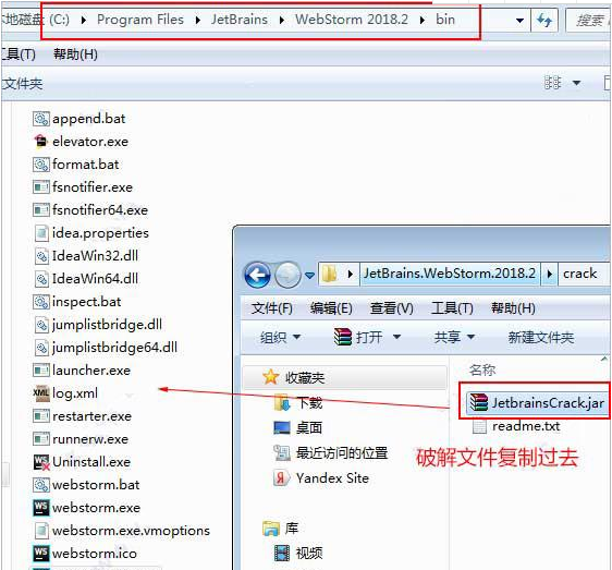 5、這時(shí)將破解文件Crack.rar解壓出來,再將“JetbrainsCrack.jar”復(fù)制到軟件安裝目錄【C:\Program Files\JetBrains\WebStorm 2018.2\bin】;