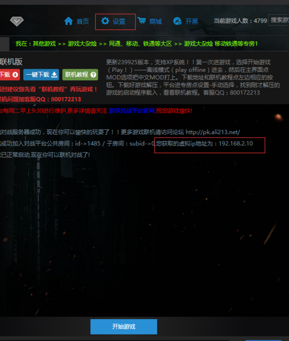 2、進(jìn)入專房時(shí),記住自己的虛擬ip地址,點(diǎn)擊設(shè)置選項(xiàng)。