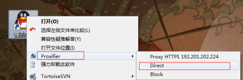 仍以QQ為例,如圖在桌面對QQ圖標(biāo)點擊右鍵,在菜單欄中依次選擇“Proxifier”-“Direct”,然后就以Direct方式打開了QQ,實現(xiàn)了不使用代理上網(wǎng)。