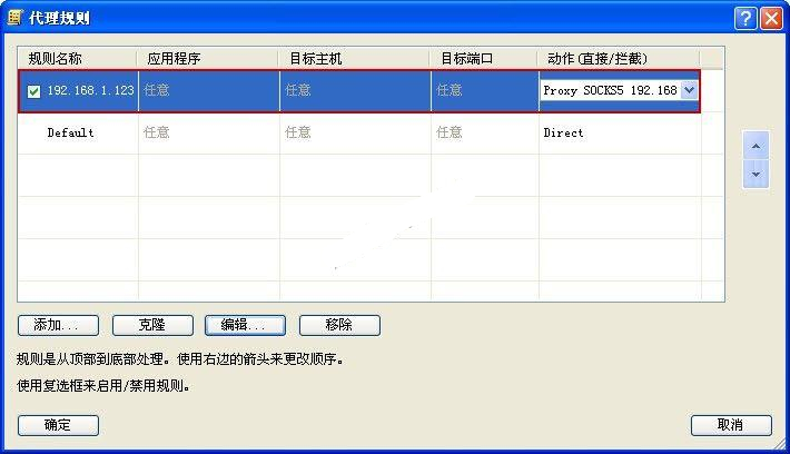 2) 在彈出的“代理規(guī)則”對話框中,選中“192.168.1.123”復(fù)選框,單擊“動作(直接/攔截)”組合框,選擇“Proxy SOCKS 192.168.1.123”,再單擊“確定”按鈕。