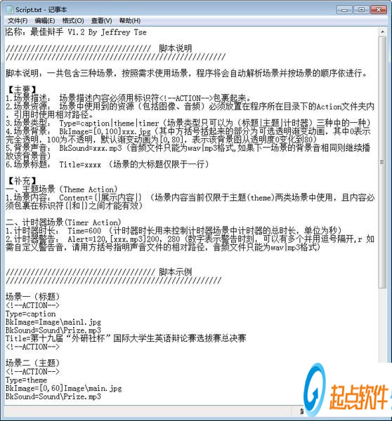 最佳辯手計(jì)時(shí)工具采用腳本編寫,如需修改其文字內(nèi)容,就要去修改腳本。場景腳本存放在程序同目錄下的Action文件夾內(nèi),文件名為Script.txt,示例一共包含三種場景,按照需求使用場景,程序?qū)詣咏馕鰣鼍安磮鼍暗捻樞蛞肋M(jìn)行。