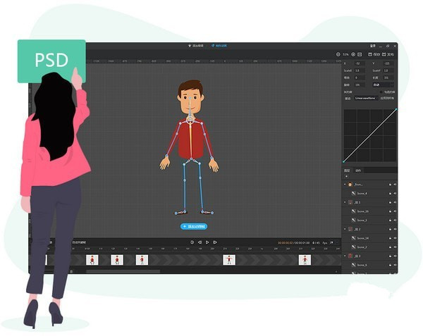 添加骨骼到圖片后,可以控制骨骼讓角色移動、任意角度旋轉(zhuǎn)。其中曲線骨骼可以讓角色的曲線變化更加圓滑流暢,從而讓動畫角色整體效果達到最佳。