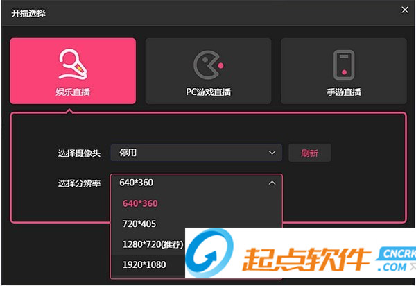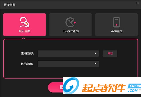 2.登錄完成后,進入選擇開播頁面可選擇三種開播類型,用于視頻直播的娛樂直播、用于電腦游戲直播的PC直播類型和手機游戲直播類型。