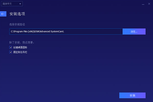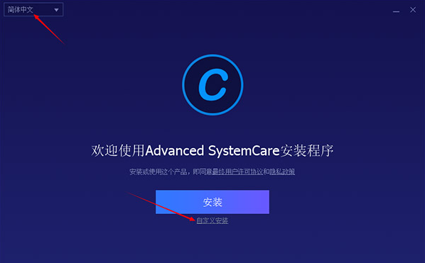 1、在本站下載Advanced SystemCare 12破解版安裝包,內(nèi)含主程序及破解補丁,解壓縮并運行主程序,選擇簡體中文并點擊自定義安裝