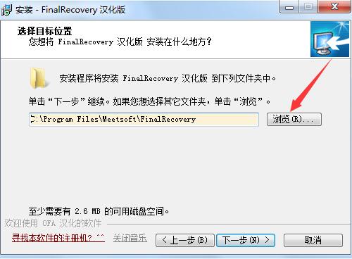 3、接下來就為finalrecovery軟件選擇目標位置了,默認軟件安裝在C盤,我們盡量選擇自定義安裝,單擊“瀏覽”按鈕選擇一個非系統(tǒng)盤的文件夾然后點擊確定。如下圖所示: