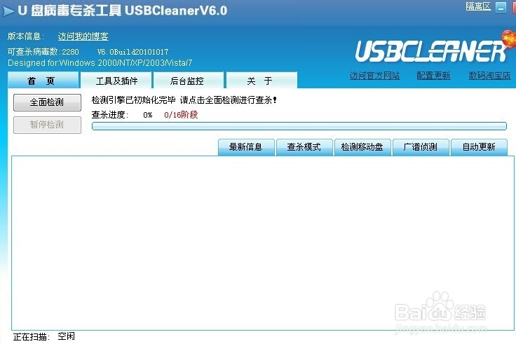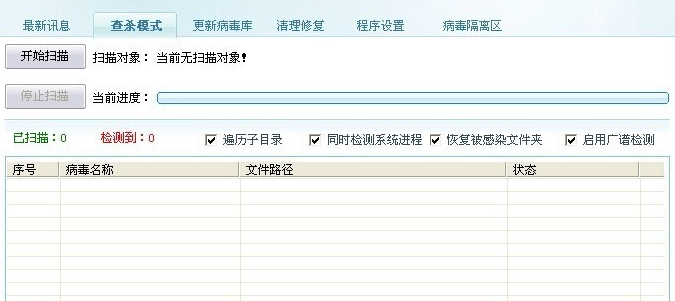 1、病毒偵測包括全面檢測,廣譜檢測以及移動盤檢測,全面檢測可精確查殺已知的U盤病毒,并對這些U盤病毒對系統(tǒng)的破壞作出修復(fù),廣譜檢測可快速檢測未知的U盤病毒,并向用戶發(fā)出警報(bào),移動盤檢測,檢測U盤,MP3等移動設(shè)備的專門模塊,要獨(dú)立使用