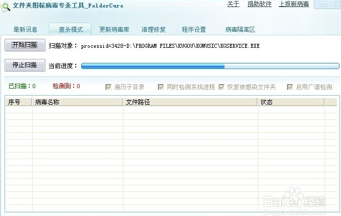 選擇完畢后,即可系統(tǒng)中的全盤進(jìn)行文件夾圖標(biāo)病毒的掃描。