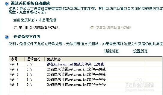 包括兩種方案供用戶選擇,包括關(guān)閉系統(tǒng)自動播放與建立免疫文件夾,可自如控制免疫的設(shè)置與取消,U盤病毒免疫可以極大減小系統(tǒng)感染U盤病毒的侵害