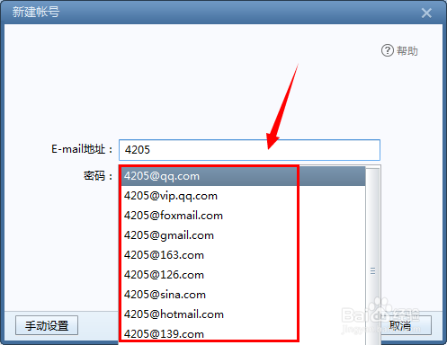 在點(diǎn)擊新建賬號(hào)的對(duì)話框之后,進(jìn)入新建賬號(hào)的向?qū)ы?yè)面。手動(dòng)輸入需要新建添加的郵箱賬號(hào),foxmail一般把常用的郵箱后綴都列出來(lái)了