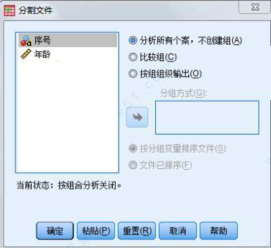 選擇拆分?jǐn)?shù)據(jù)后,輸出結(jié)果的排列方式,該對(duì)話框提供了3種方式:對(duì)全部 觀測(cè)進(jìn)行分析,不進(jìn)行拆分;在輸出結(jié)果種將各組的分析結(jié)果放在一起進(jìn)行比較;按組排列輸出結(jié)果,即單獨(dú)顯示每一分組的分析結(jié)果。
