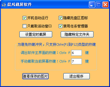 第四步:設(shè)置調(diào)出軟件主界面的熱鍵,默認(rèn)是同時(shí)按下Ctrl和F6鍵,則會(huì)調(diào)出軟件主界面,你也可以通過(guò)輸入別的數(shù)字來(lái)修改此熱鍵。如果同時(shí)按下Ctrl和F7鍵,不管之前有沒(méi)有設(shè)置定時(shí)截屏參數(shù),都會(huì)手動(dòng)截屏一次。同樣你也可以修改此默認(rèn)熱鍵。如果你要查看截屏之后自動(dòng)保存的圖片,可以點(diǎn)主界面上的“查看保存的圖片”按鈕,軟件會(huì)自動(dòng)打開(kāi)圖片文件夾(即使你之前設(shè)置了隱藏此文件夾)。