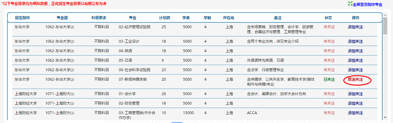 點(diǎn)擊右邊的“取消關(guān)注”按鈕可取消已關(guān)注的院校專業(yè)。