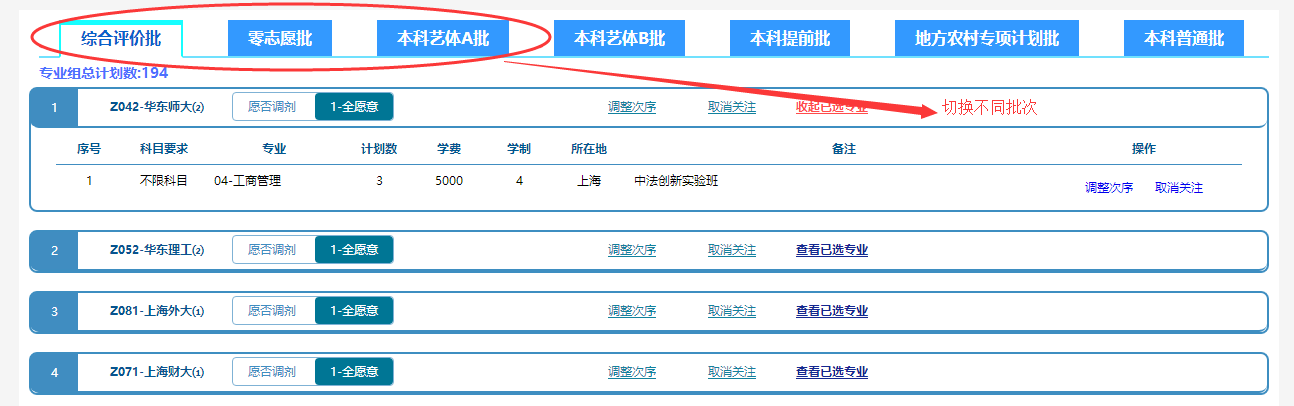 各個(gè)批次之間可以通過標(biāo)簽切換,選擇您需要查看的批次,并選擇查看已選專業(yè),下側(cè)將顯示該專業(yè)組中所有被關(guān)注的專業(yè)。