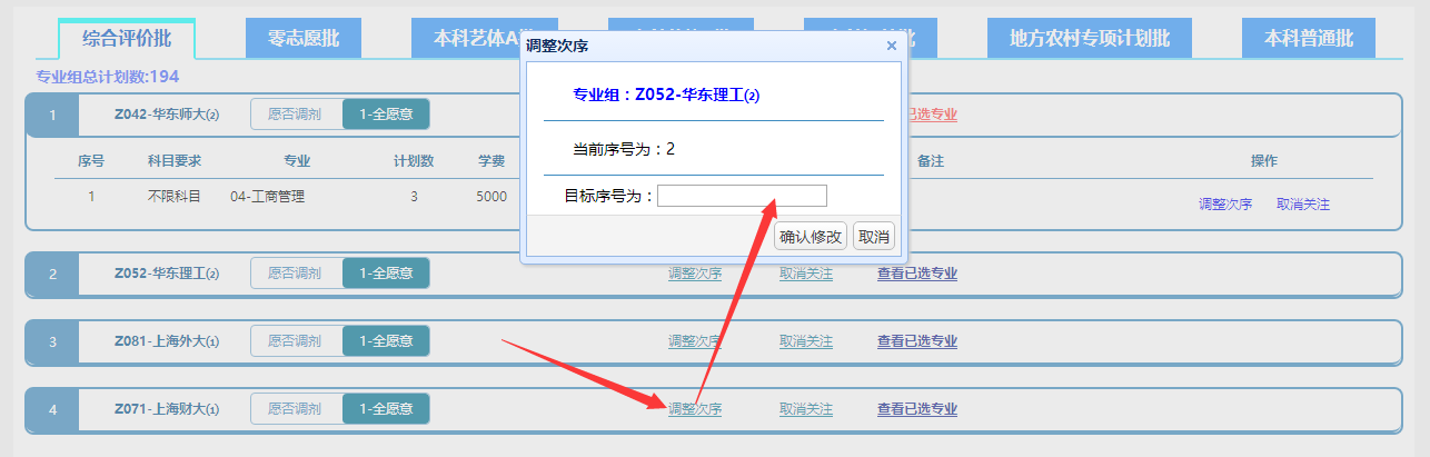 調(diào)整次序可調(diào)整專業(yè)組或?qū)I(yè)的先后順序,在彈出框中‘目標(biāo)序號(hào)’處輸入希望調(diào)整到的志愿序號(hào),點(diǎn)擊‘確認(rèn)修改’按鈕即可完成操作。