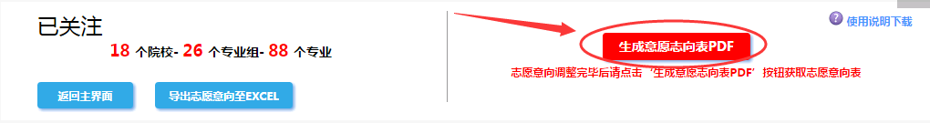 當(dāng)確認(rèn)了自己的志愿意向后可點(diǎn)擊“生成志愿意向表PDF”按鈕,生成pdf格式的意向志愿表。
