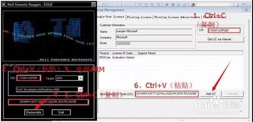 4、復(fù)制CID中的內(nèi)容,將其粘貼到到2處的CID中,然后選擇Target選項(xiàng)框中ARM選項(xiàng),再點(diǎn)擊Generate,然后復(fù)制5處的內(nèi)容,將其粘貼到6處的New license中然后點(diǎn)擊Add LIC。