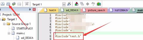 4.在文件開頭處寫入“#include text.h”如圖所示,然后點(diǎn)擊“編譯”按鍵;