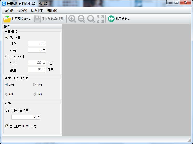 5. 如果您想一次性分割多張圖片,可以使用”批量分割“功能。 點(diǎn)擊工具條上的”批量分割“按鈕,可以打開批量分割界面,如下圖所示: