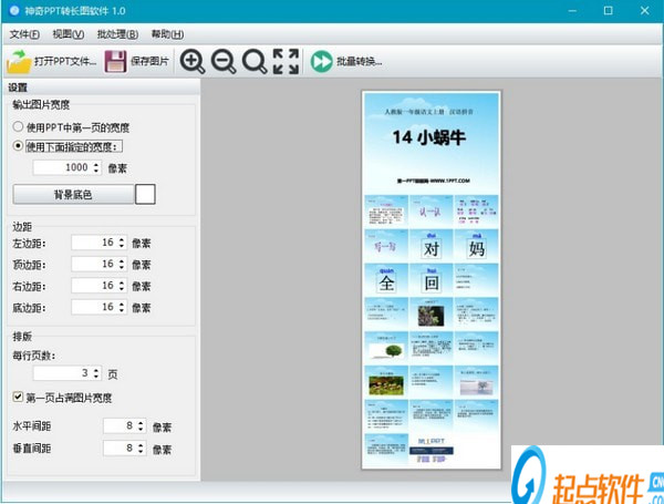 4. 更重要的是,本軟件支持設(shè)置將多頁PPT幻燈片在長圖里排成一行,并可以設(shè)置單元格的水平間距和垂直間距,還可以設(shè)置是否將第一頁幻燈片占滿整個圖片的寬度;
