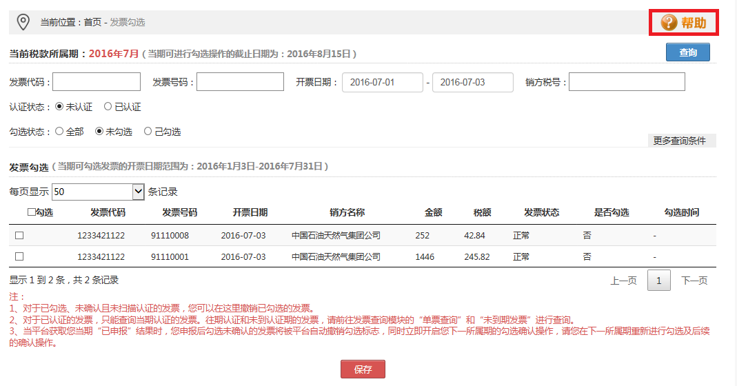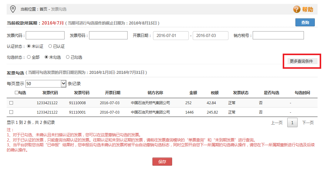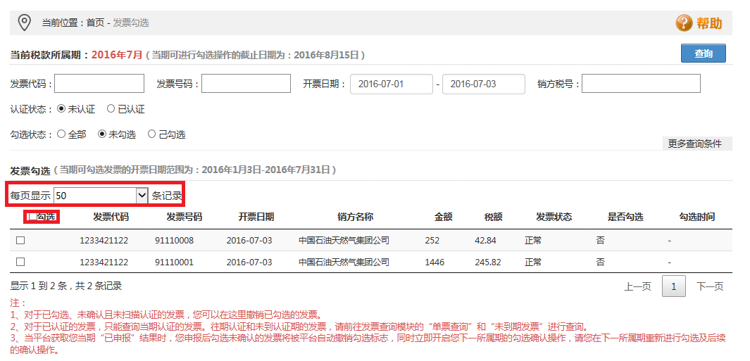 (2)下部為查詢結(jié)果的勾選操作區(qū)域,本期可勾選發(fā)票的截止日期為2016年8月15日。