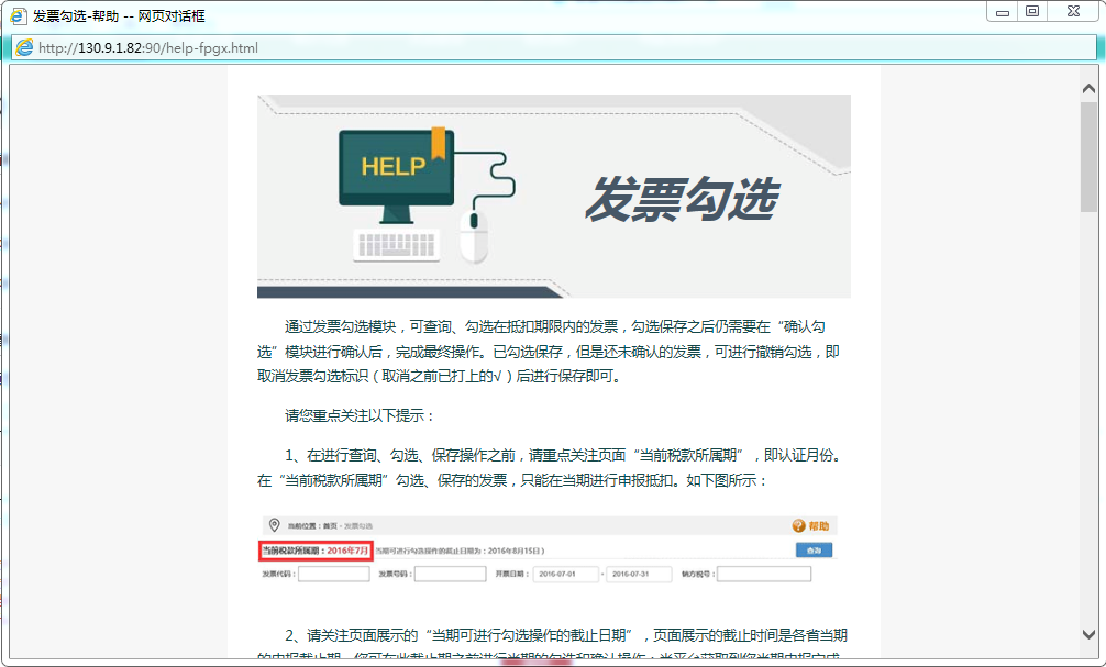 點擊頁面右上角的“幫助”按鈕,可以查看“發(fā)票勾選”模塊的關(guān)注要點信息,如下圖所示: