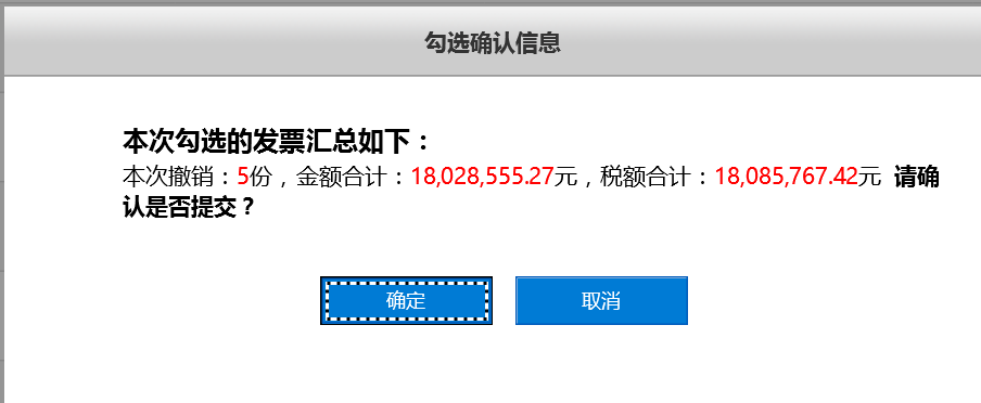 (4)完成本次所有發(fā)票的勾選或撤銷操作后,點擊“保存”按鈕,系統(tǒng)會提示本次勾選或撤銷勾選的發(fā)票匯總情況,點擊“確定”按鈕即可完成所有勾選發(fā)票的保存操作(所有發(fā)票全部勾選完成后保存一次即可,不需要在每一個查詢結(jié)果分頁中分別點擊保存操作);