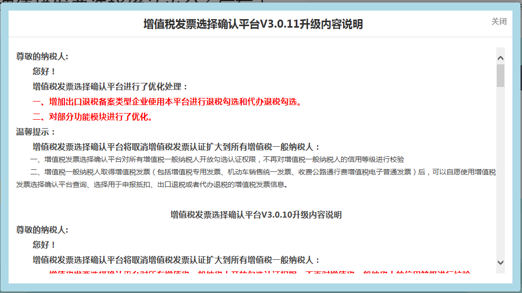 “增值稅發(fā)票查詢平臺V3.0.11.升級內(nèi)容說明”窗口。