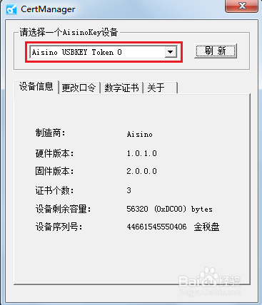 2、將金稅盤連接到本地電腦的USB接口后(首次需要等待系統(tǒng)完成驅(qū)動的自動加載方可),點擊“刷新”按鈕,可以刷新到AisinoKey設(shè)備即表示驅(qū)動安裝正常。