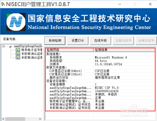 2、將稅控盤連接到本地電腦的USB接口后(首次需要等待系統(tǒng)完成驅(qū)動的自動加載方可),點擊“系統(tǒng)檢測”按鈕,可以顯示如下信息即可: