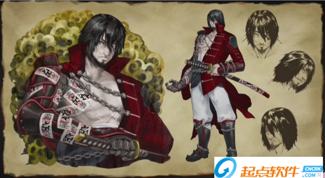游戲中的登場(chǎng)武士“斬月”,他的右臂貼滿了顯眼的符咒。