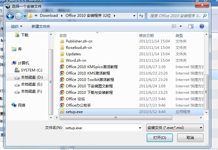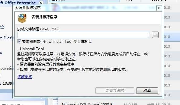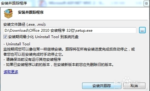 點擊跟蹤安裝,彈出來一個窗口。然后點擊“安裝文件路徑”最右邊一個“…”的按鈕,選擇安裝程序。這里我們用office2010的安裝程序演示,雙擊打開“setup"文件,然后點擊確定。之后軟件會自動最小化,按照正常安裝的步驟做就行了。