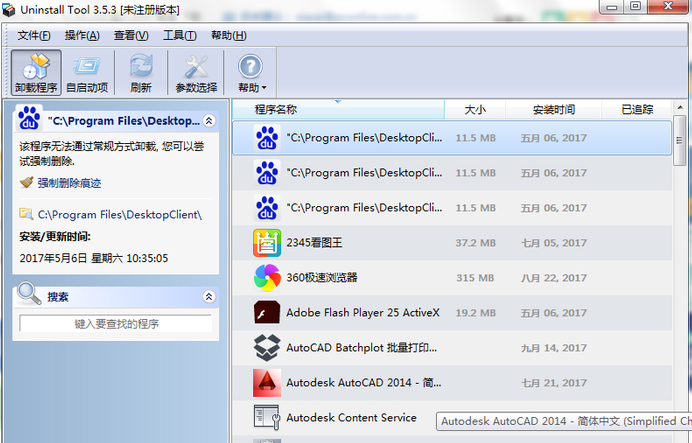 6、使用強(qiáng)制刪除可以卸載注冊表中的相關(guān)條目