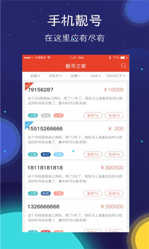 靚號(hào)之家是一款關(guān)于手機(jī)號(hào)、車牌號(hào)、固定電話號(hào)碼等一些信息發(fā)布平臺(tái),靚號(hào)之家app可以在首頁找到你想要的手機(jī)號(hào),車牌號(hào),固定電話號(hào)碼,并且可以直接與發(fā)布者電話聯(lián)系或者通過app內(nèi)聊天的方式與發(fā)布者取得聯(lián)系。